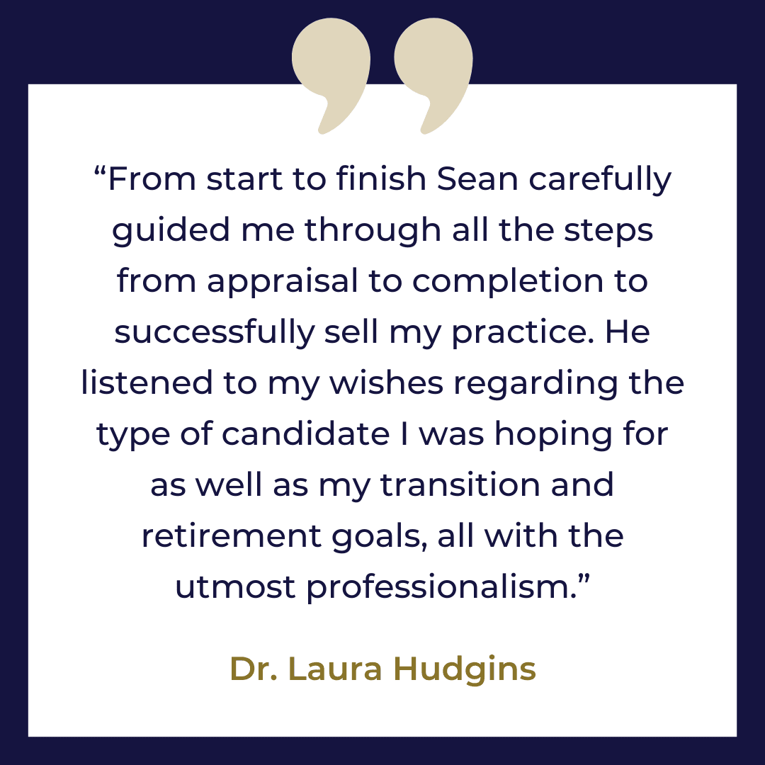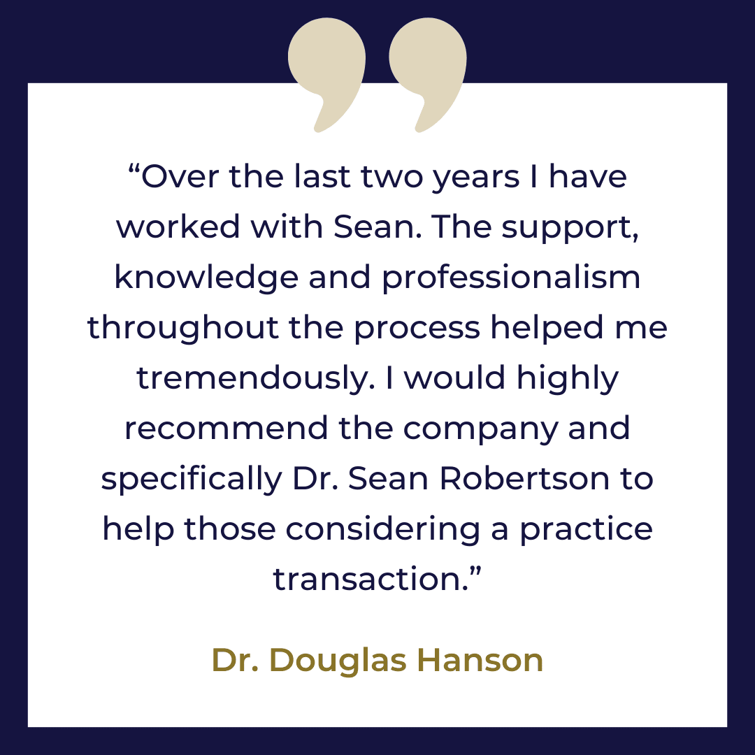 Dr. Sean Robertson has accrued in helping colleagues successfully navigate their exit from practice ownership.